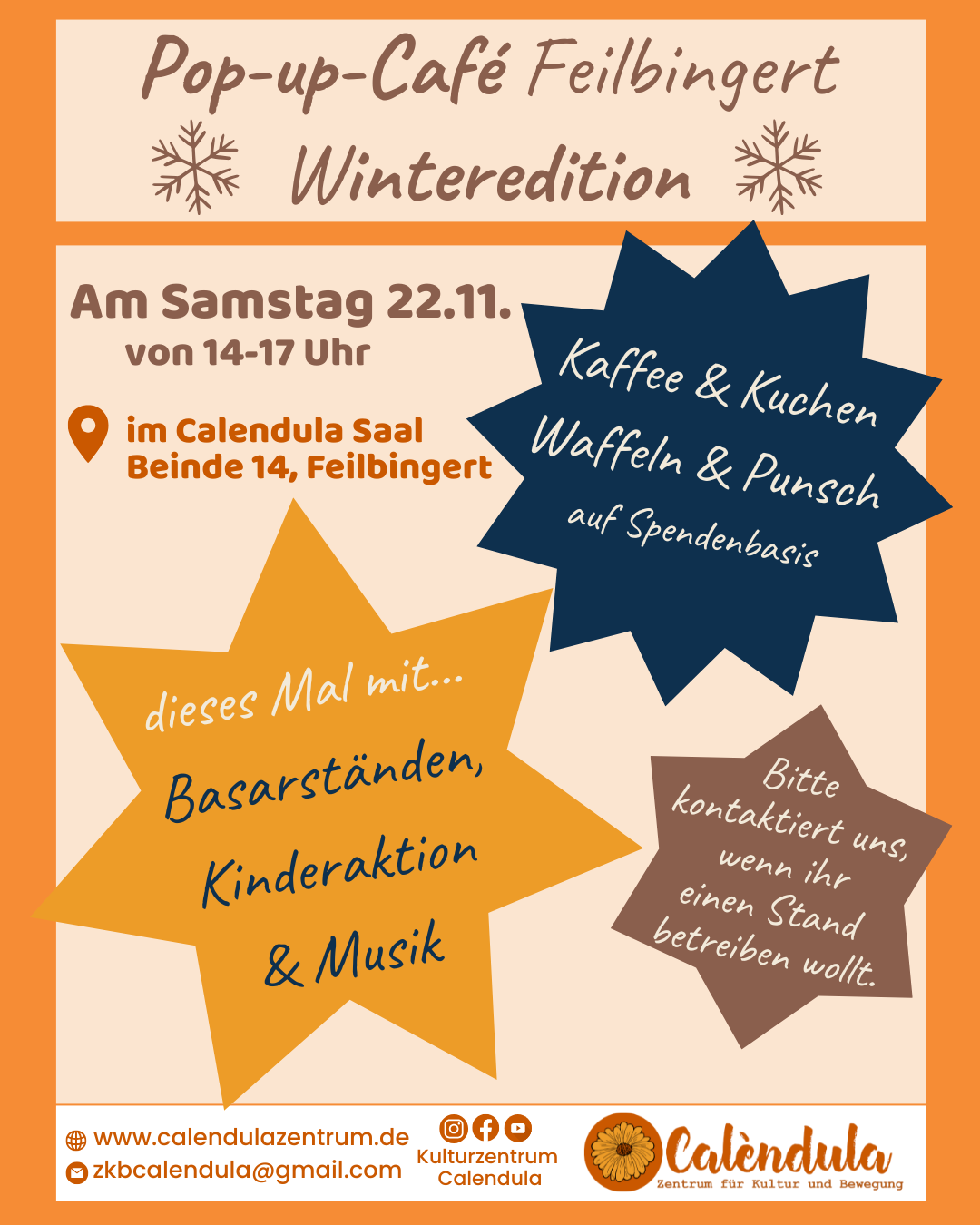 Noch vor Beginn der Adventszeit laden wir euch herzlich ins Kulturzentrum Calendula zur Winteredition des Feilbingerter Pop-up-Cafés ein. Es erwarten euch Kaffee, Kuchen, Waffeln und Punsch, stimmungsvolle Basarstände, eine kreative Kinderaktion sowie musikalische Beiträge, die für eine vorweihnachtliche Atmosphäre sorgen.